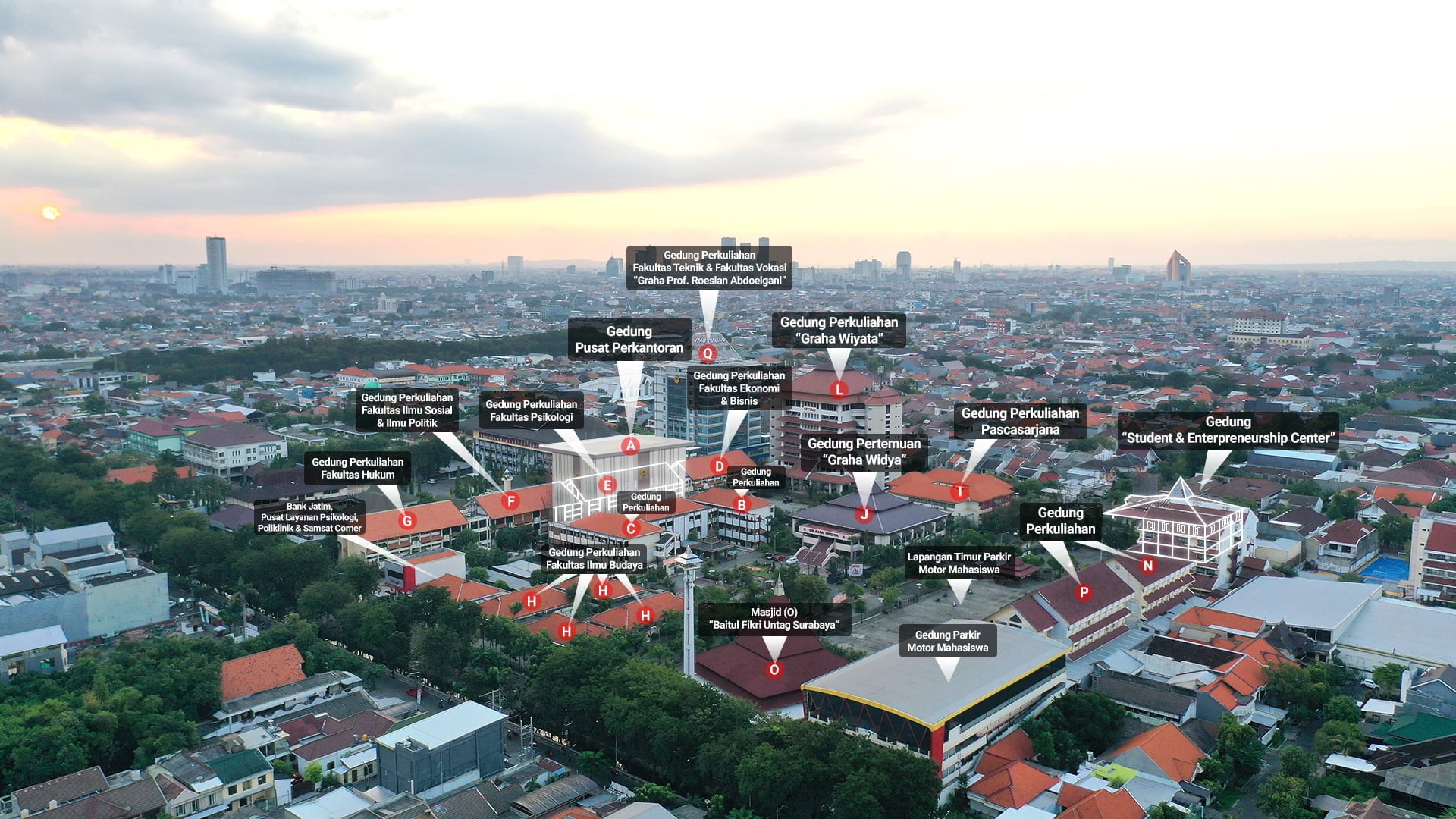 Kampus UNTAG Surabaya sendiri berlokasi di Jalan Semolowaru No. 45. Saat ini, UNTAG Surabaya mengelola enam fakultas, yaitu Fakultas Ilmu Sosial dan Politik (FISIP), Fakultas Hukum (FH), Fakultas Ekonomi (FE), Fakultas Psikologi, Fakultas Teknik (FT), dan Fakultas Sastra (FS).
