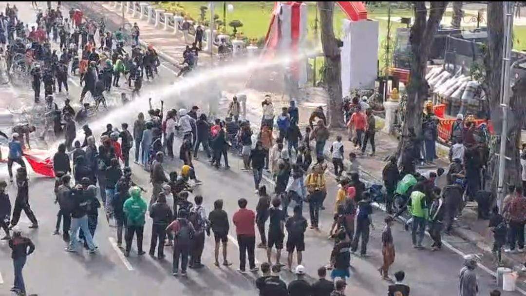 Namun, imbauan tersebut tidak diindahkan oleh massa. Sebagai respons, petugas kepolisian menyemprotkan air dari water canon ke arah massa aksi untuk membubarkan kerumunan. Aksi saling dorong dan lempar pun terus berlanjut, menyebabkan situasi semakin tidak terkendali.