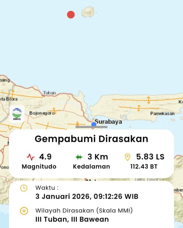 Infosurabaya.com – Gempa bumi berkekuatan magnitudo 4,9 mengguncang wilayah perairan Tuban, Jawa Timur, Sabtu (3/1/2026) malam. Guncangan tercatat terjadi pada pukul 09.12 WIB.