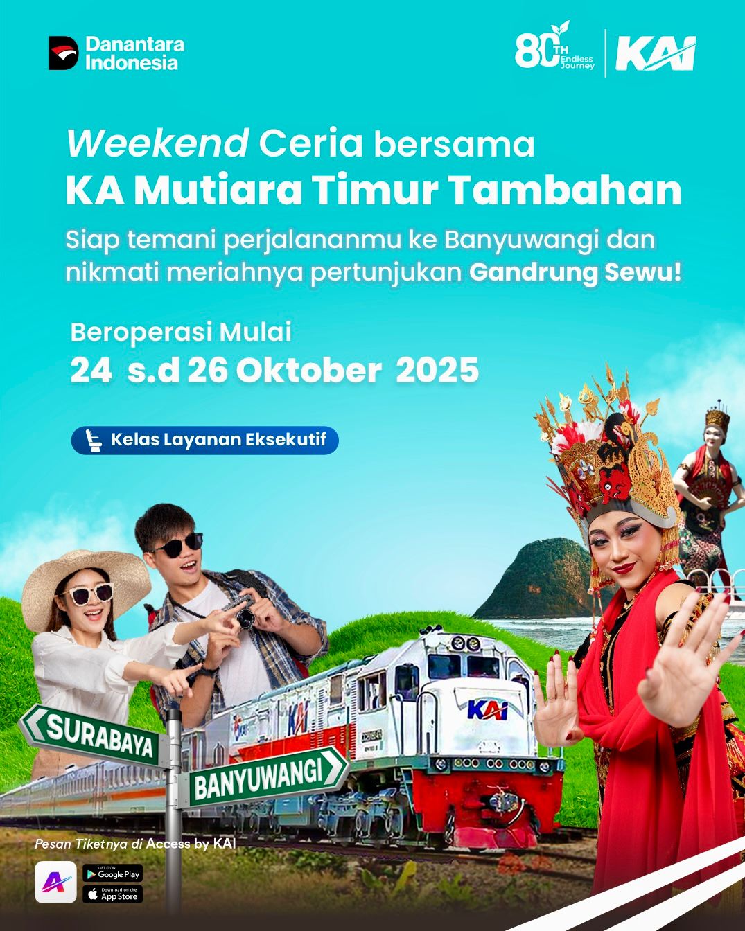infosurabaya.com | SURABAYA –PT Kereta Api Indonesia (Persero) Daerah Operasi 8 Surabaya menghadirkan pengalaman perjalanan *redmewa bertajuk “Weekend Ceria Bersama KA Mutiara Timur Tambahan”, untuk memeriahkan akhir pekan para pelanggan yang ingin menikmati keindahan Banyuwangi sekaligus menyaksikan kemegahan Festival Gandrung Sewu 2025.