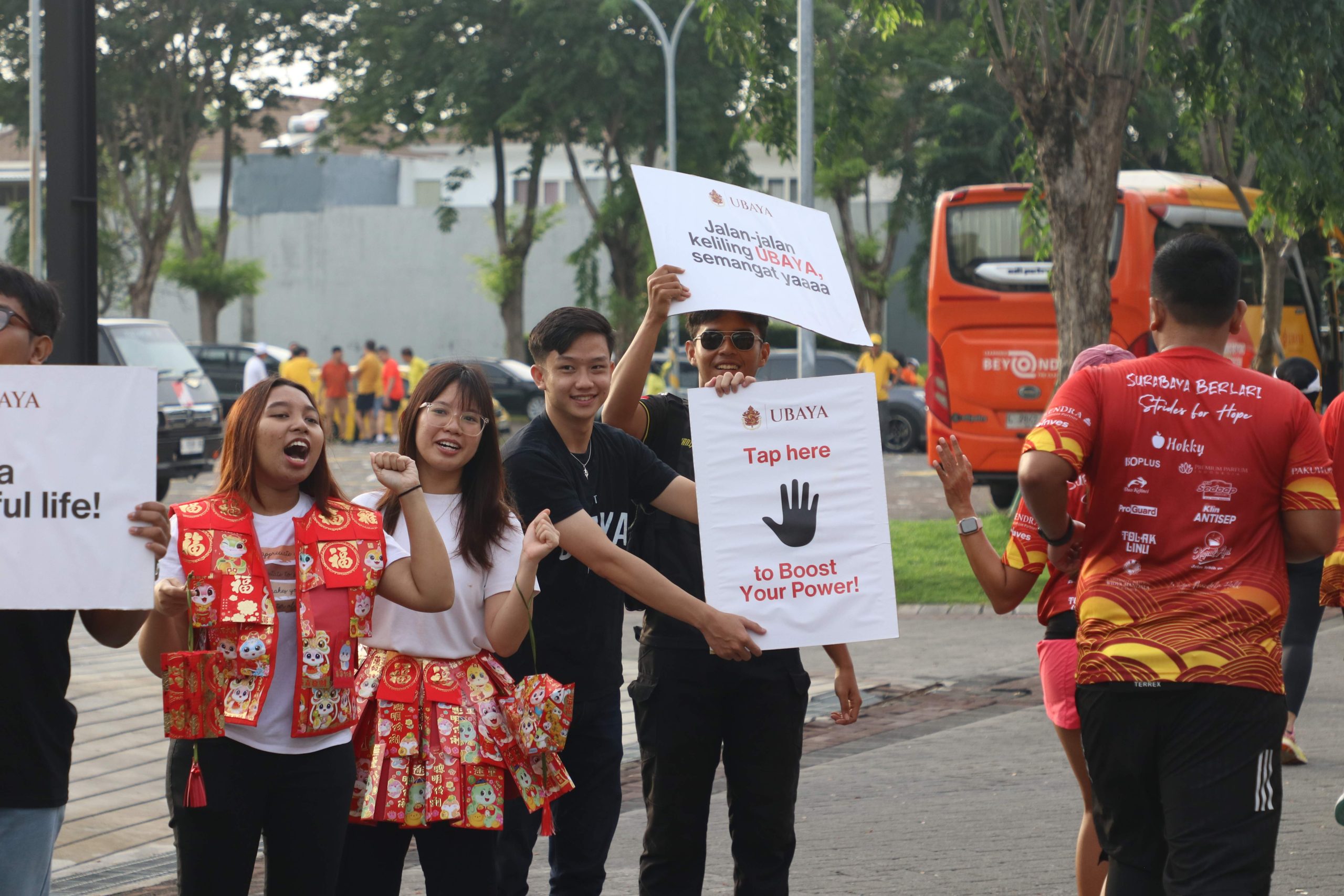 infoSurbaya |Surabaya Badan Eksekutif Mahasiswa Universitas Surabaya (BEM Ubaya) berpartisipasi dalam acara Sincia Run 2025 pada Minggu (09/02). Sebanyak 16 anggota BEM Ubaya menjadi pemandu sorak dengan mengenakan kostum yang terbuat dari angpao sambil membawa papan slogan. Kegiatan ini dilakukan pada Minggu (9/2/2025) di depan Hokky Supermarket Pakuwon City.