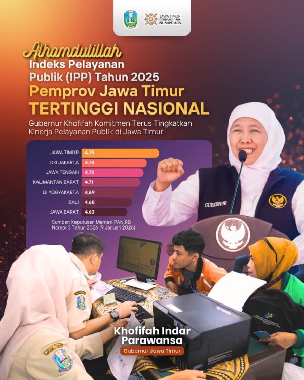 Infosurabaya.com – Pemerintah Provinsi Jawa Timur mencatat prestasi nasional dengan meraih kinerja penyelenggaraan pelayanan publik terbaik tahun 2025. Penetapan tersebut dikeluarkan Kementerian PAN-RB, dengan Indeks Pelayanan Publik (IPP) Jawa Timur mencapai 4,75 atau kategori A (Prima), tertinggi di antara seluruh provinsi di Indonesia.