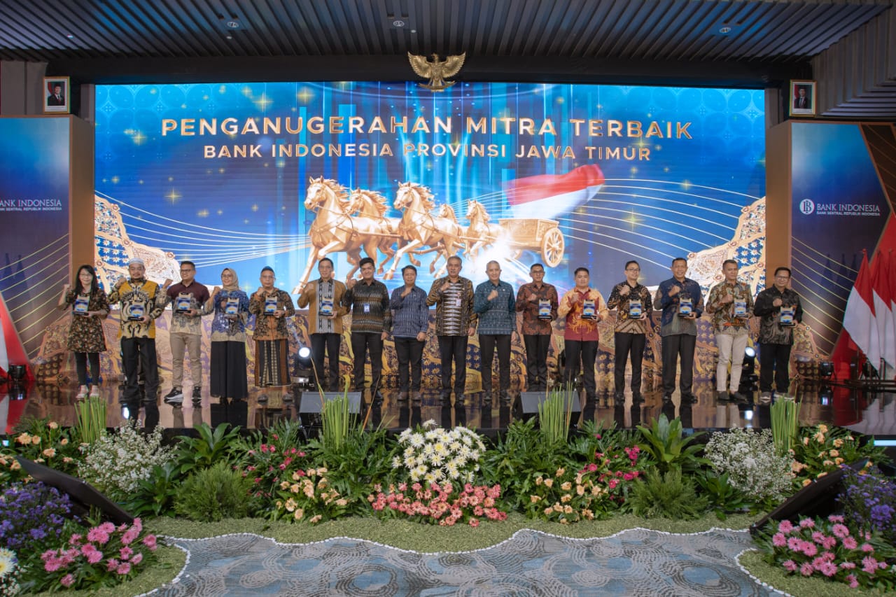 Pada kesempatan yang sama, Kantor Perwakilan Bank Indonesia Provinsi Jawa Timur menyelenggarakan Pertemuan Tahunan Bank Indonesia (PTBI) 2025 yang dihadiri mitra strategis Jawa Timur dari pemerintah provinsi, Bupati/Walikota, forkompimda, instansi vertikal, perbankan, akademisi, hingga asosiasi, yang diawali relay hybrid PTBI Nasional dilanjutkan dengan pemaparan outlook perekonomian Jawa Timur, arahan strategis pemerintah Provinsi Jawa Timur dan pemberian apresiasi bagi mitra sinergi Bank Indonesia Provinsi Jawa Timur. Adapun pada gelaran PTBI 2025, Pemerintah Provinsi Jawa Timur memperoleh award untuk kategori Tim Percepatan dan Perluasan Digitalisasi Daerah (TP2DD) Terbaik 2025 untuk Kawasan Jawa – Bali. (daftar penerima apresiasi sebagaimana terlampir) deputi Kepala Perwakilan, M. Noor Nugroho, menyampaikan bahwa pada triwulan Ill 2025 ekonomi Jawa Timur tumbuh solid 5,22% (yoy), menjadi kontributor terbesar kedua nasional, diperkirakan tumbuh 4,7%-5,5% (yoy) pada 2025 dengan inflasi 2,5±1%. Pada tahun 2026, perekonomian Jawa Timur diprakirakan semakin tumbuh kuat di kisaran 4,8% 5,6% (yoy) ditopang keyakinan konsumen dan penjualan ritel, serta adanya stimulus pemerintah.