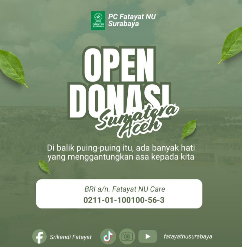 Informasi penggalangan donasi juga disebarluaskan melalui berbagai kanal media sosial resmi Fatayat NU Surabaya seperti Facebook, TikTok, Instagram, dan YouTube agar semakin banyak warga yang tergerak membantu.