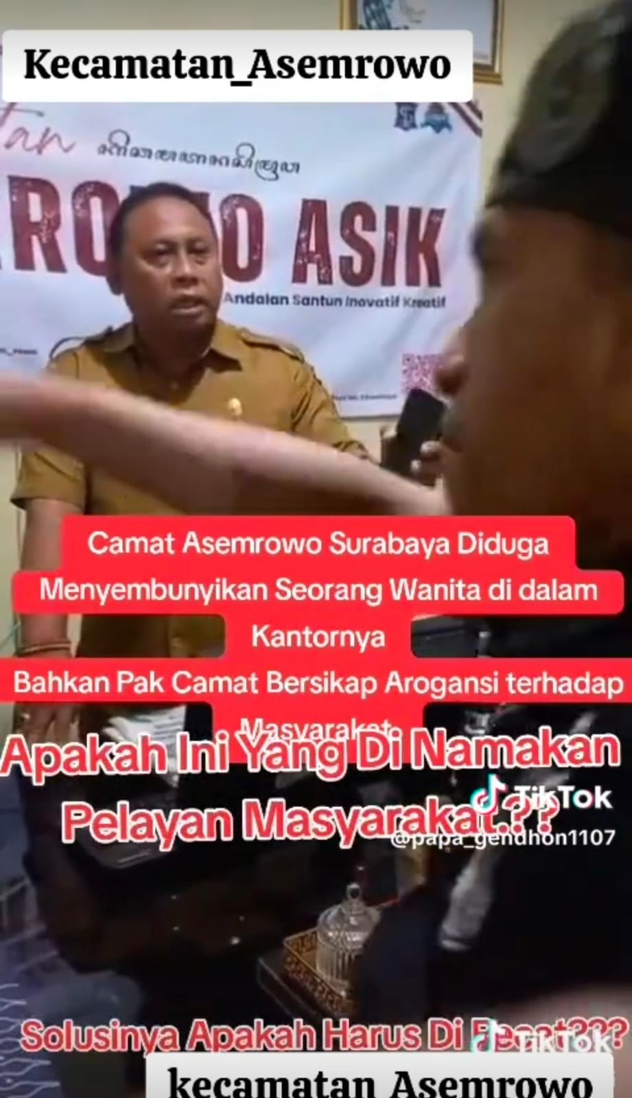 Dalam video tersebut terlihat Camat Asemrowo yang diketahui bernama Muhammad Khusnul Amin sempat berdebat dengan warga yang akan memasuki ruangan kerjanya.
